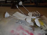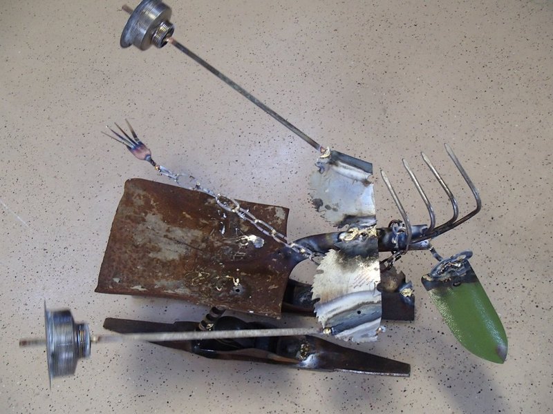 This is an example of how they all come together. We start with all kinds of odd metal scraps. Once welded, each WackyWeld is primed and hand painted with 2 coats of paint. Then a coat of high quality gloss to protect them from the elements. But be advised, they will weather nicely over time outside.